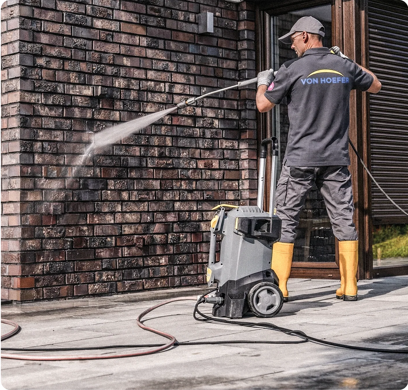 • Heißwasser-Hochdruck und Dampfreinigung: Effektiv gegen hartnäckigen Ruß, Feinstaub und Abgase an Klinkerfassaden, Betonfassaden und robusten Natursteinfassaden wie Sandstein oder Ziegelfassaden.